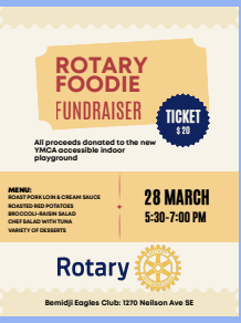 Help raise money for the future YMCA indoor playground! Come join us for a delicious supper on Saturday, Mar. 28, at the Bemidji Eagles Club. We will be serving roast pork with cream sauce and sun dried tomatoes, broccoli raisin bacon salad, roasted red potatoes, chef salad with tuna, and a variety of desserts. The meal is hosted by Bemidji Sunrise Rotary club, and tickets are $20. You can buy tickets at the door or from any Rotarian. We will be serving from 5:30 to 7 pm, and 100% of proceeds will go to the playground fund.
